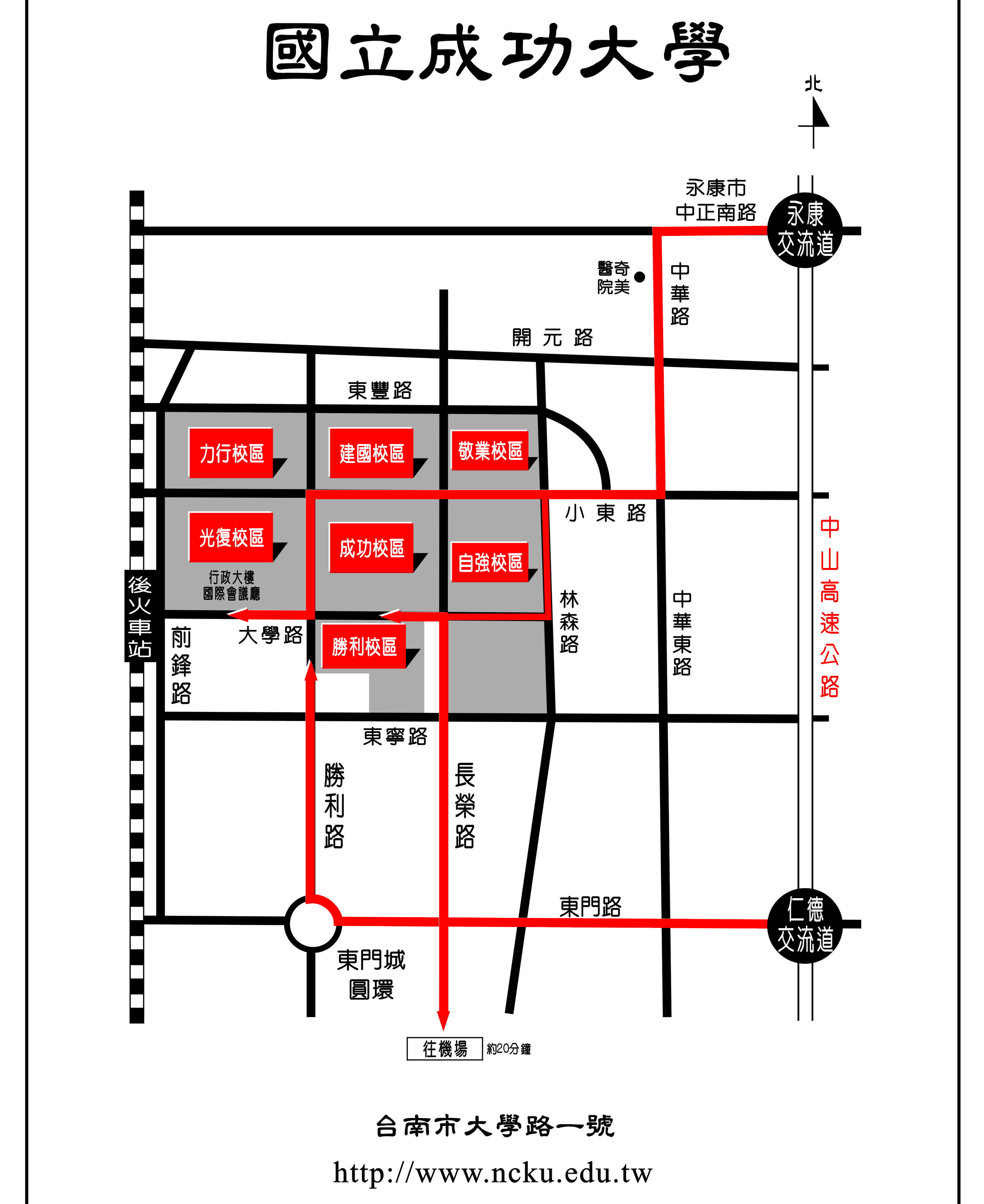 - 北上:沿國道一號北上 → 下仁德交流道左轉 → 沿東門路(西向)往台南市區直走 → 遇林森路或長榮路右轉(北向),即可抵達本校。